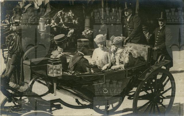 Elena e Vittoria in equipaggio assieme al Duca d'Aosta e al Principe Umberto durante la visita dei Reali di Inghilterra nel maggio del 1923 a Roma.