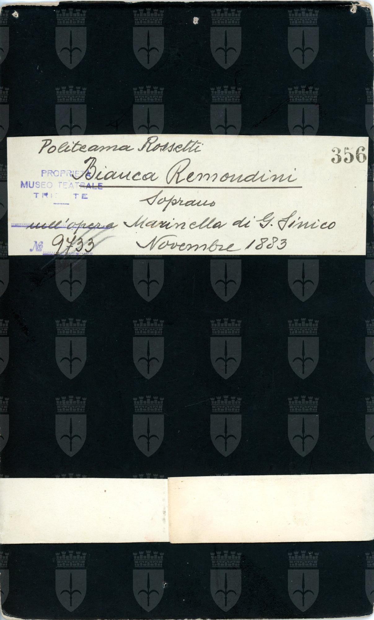 In costume. Cantò nel 1883 al Politeama Rossetti di Trieste "Marinella" e "Ruy Blas"