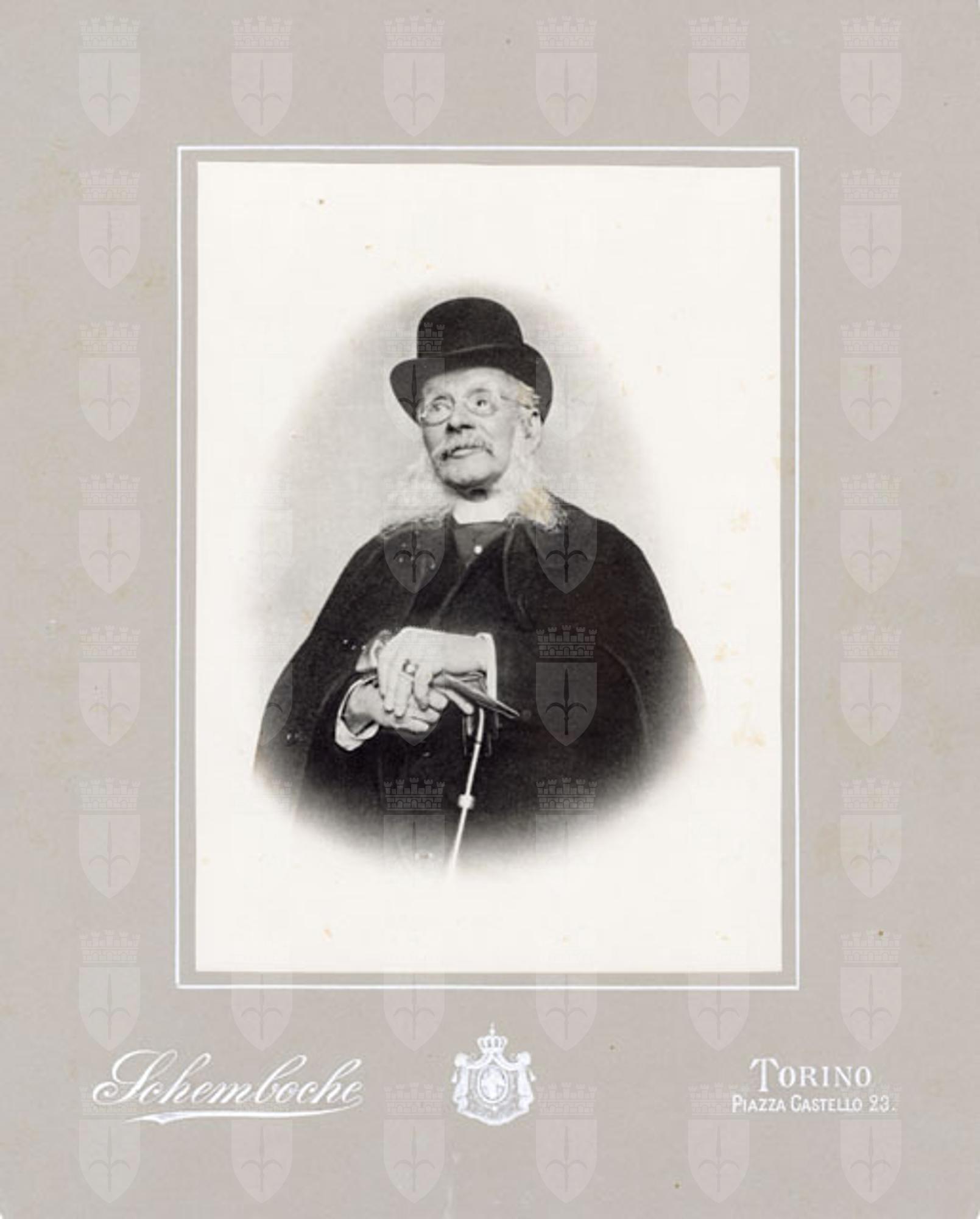 L'anziano barone è ripreso frontalmente con bastone, mantella e cappello a cilindro. Impugna un paio di guanti