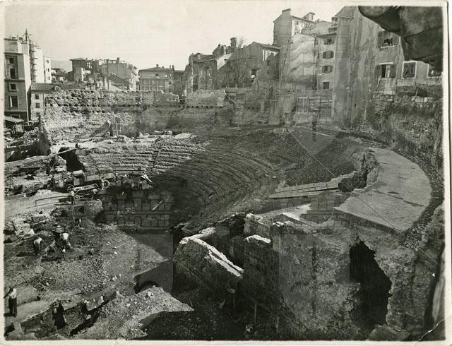 Veduta dello scavo del teatro romano nella zona di Donota in Cittavecchia ripresa dall'estremità sud-occidentale della cavea. La foto, scattata l'8 marzo del 1938, permette di constatare lo stato di avanzamento dei lavori che si concluderanno di lì a poco, il 21 aprile successivo, data dell'inaugurazione del monumento e della sua apertura al grande pubblico. Al momento dello scatto lo scavo ha messo in luce il muro perimetrale della cavea, la gradinata fino all'orchestra e sta proseguendo in corrispondenza della zona dell'orchestra e del frontescena, in corrispondenza del quale iniziano ad emergere i primi resti del muro di fondo.