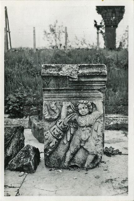 Pluteo lapideo con amorino ghirlandoforo dal foro di Aquileia. Il pluteo, conservato in condizione frammentaria, ritrae un amorino che regge una ghirlanda carica di foglie e fiori al quale doveva corrispondere, in posizione speculare a sostenere il capo opposto del festone, un secondo personaggio alato. La lastra appartiene al tratto orientale del portico che circondava il foro nei lati lunghi e nel meridionale, e più precisamente all'attico che lo sormontava, dove si alternava a plinti decorati con teste di Medusa e di Giove Ammone: i plinti erano collocati in corrispondenza delle colonne e i plutei degli intercolumni. Il programma decorativo così composto, presente in altri fori di area altoadriatica, rivestiva una precisa valenza simbolica collegabile alla tematica celebrativa del culto imperiale, percepibile soprattutto nelle protomi di Giove Ammone e Medusa, che rappresenterebbero gli estremi Orientale e Occidentale dell'Impero. Ad Aquileia questa decorazione, opera di maestranze attive anche a Tergeste, dove teste affini di Medusa e Giove Ammone decoravano la basilica forense, si pone in età giulio-claudia, verosimilmente negli anni immediatamente successivi la metà del I sec. d.C.