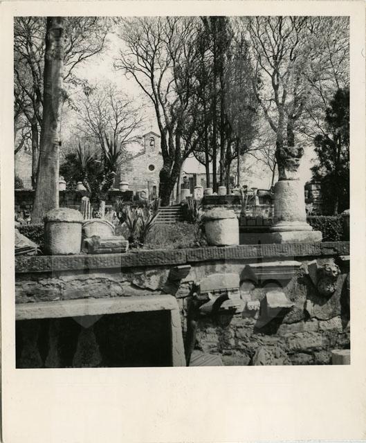 Veduta dei ripiani dell'Orto Lapidario del Museo di Storia ed Arte di Trieste con la chiesetta di San Michele al Carnale sullo sfondo.