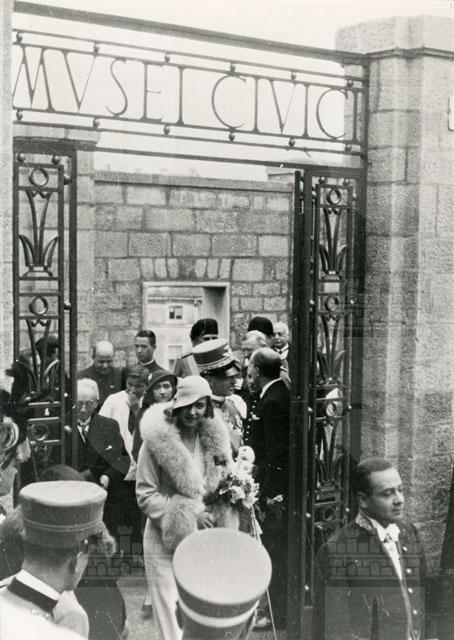 Il principe Umberto di Savoia e la moglie Maria José del Belgio escono dal nuovo ingresso appena inaugurato del Museo di Storia ed Arte di Trieste. Presso il cancello, sulla sinistra il podestà senatore Pitacco, a destra il pittore Guido Cadorin.