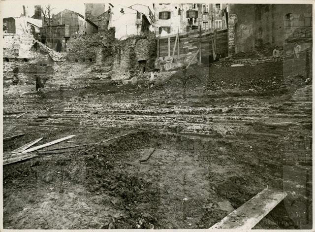 Scavo del teatro romano in Cittavecchia, tra le aree di Riborgo e Donota. La foto inquadra la porzione meridionale della cavea, di cui sono stati messi in luce il muro perimetrale e la parte più alta della gradinata dalla "summa cavea" fino ai primi gradini dell'"ima cavea", oltre la "praecinctio", ossia il corridoio semianulare che divide i due settori della gradinata. I gradini ripresi nella foto si collocano tra il terzo e il quarto "scalaria" partendo da est. Come si apprende dalla relazione mandata da l'ispettore che dirigeva le operazioni di recupero, il dott. B. Molajoli, a Rudolf Horn per la rivista Archäologischen Anzeiger del 1938, i gradini "erano in laterizi rivestiti di lastre di pietra". Nella foto sono ridotti per lo più al nucleo di opera incerta sul quale erano appoggiate le lastre lapidee.