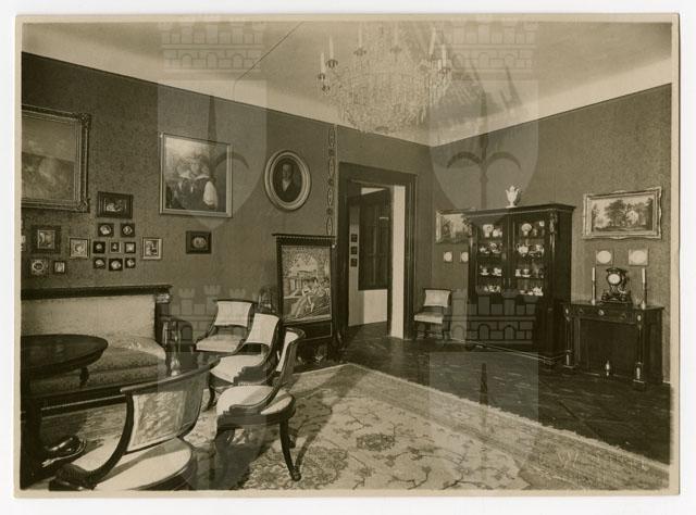 Mostra La casa dei nostri nonni : grande salone stile impero, camera da letto stile impero, anticamera, salottino di musica Biedermeier, salottino, salotto Biedermeier, camera da pranzo stile impero, salotto Biedermeier