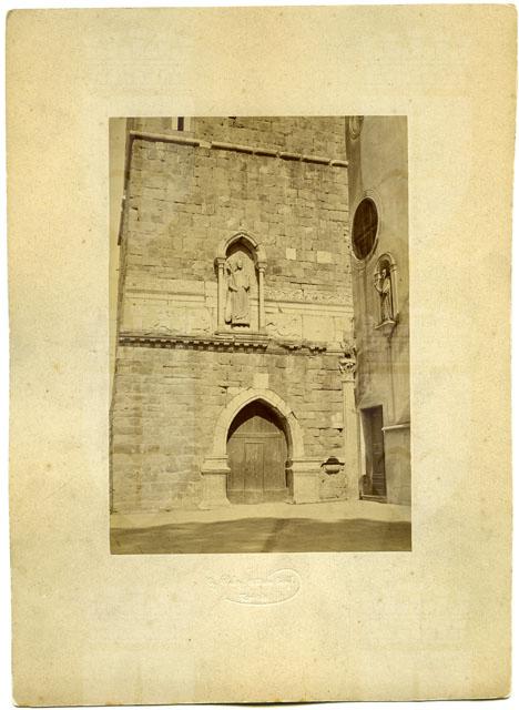 Facciata del campanile con le basi di monumenti romani e nicchia sulla facciata della chiesa con la statua in legno di san Giovanni evangelista