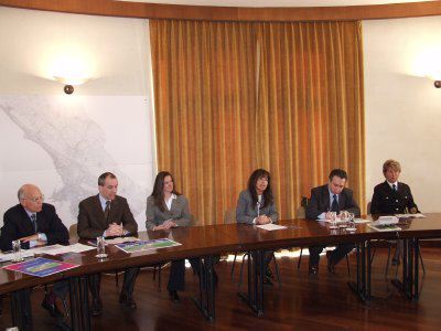 Angela Brandi, Enrico Sbriglia, Bernardina Mantovani Comandante dei Vigili Urbani, Claudio Saccari presidente dell'Eurocom seduti al tavolo della sala della giunta comunale