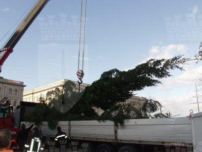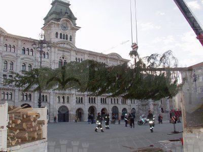 Operazioni per la posa dell'albero di Natale in piazza Unità d'Italia.