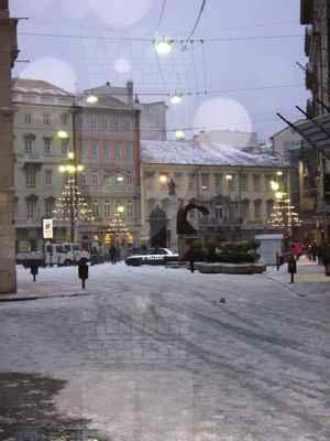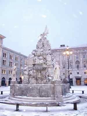 Piazza Unità d'Italia, il Molo Audace e le Rive, via Malcanton e piazza della Borsa sotto la neve