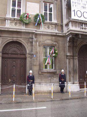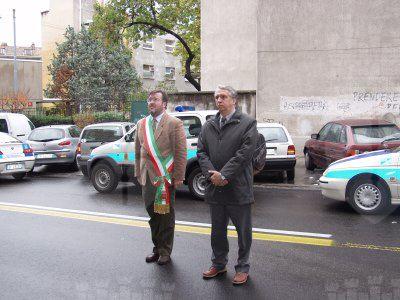 L'assessore Fulvio Sluga ed il consigliere Silvano Magnelli commemorano con corone d'alloro le targhe ai Caduti del '53, ai Caduti del 5 maggio '53, la targa Beltramini '45, le targhe ai Caduti antinazisti del '44 ed ai 41 martiri antifascisti del '44