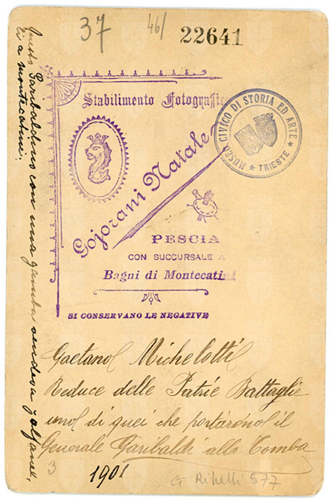 Ritratto a figura intera del garibaldino Gaetano Michelotti. Il soggetto porta al petto quattro medaglie e mostra la presenza di una protesi alla gamba.