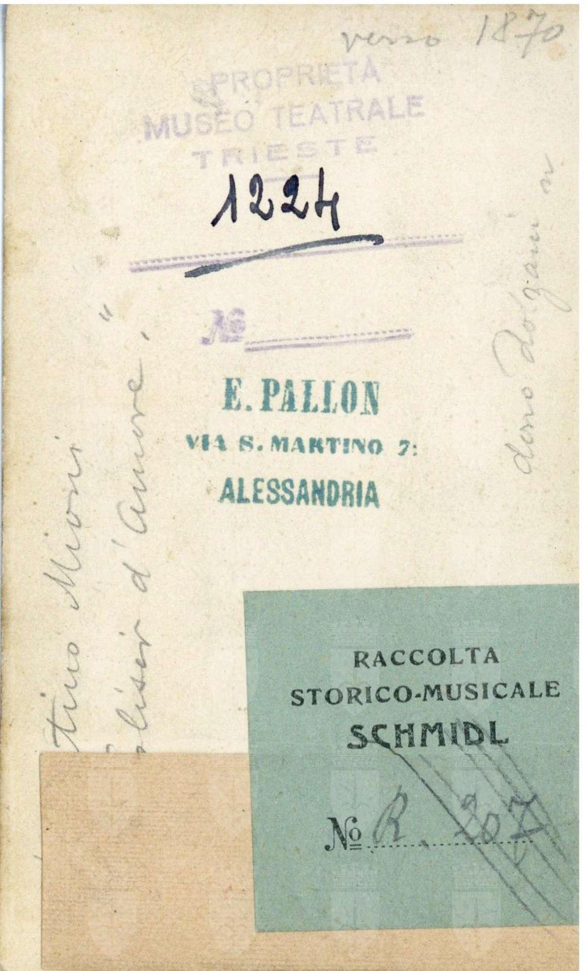 In costume con [?] nell'Elisir d'amore. Allievo del m.° G. A. Scaramelli. Una locandina del Teatro Galimbeni di Vigevano riporta una serata a beneficio del basso comico assoluto Valentino Mioni il giovedì 10 febbraio 1870 ( in rassegna stampa triestini)