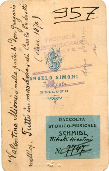 In costume nella parte di Don Gregorio in "Tutti in maschera" di Carlo Pedrotti. Basso comico e violinista, allievo del m.° G. A. Scaramelli
