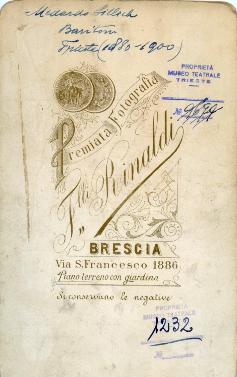 In costume nel ruolo di Jago in "Otello". Cantò al Politeama Rossetti di Trieste in concerto di beneficenza il 12.12.1888 , e il 15.11.1901 in concerto con la violinista Teresina Tua. Nel 1889 a Parma nella "Carmen" e alla Scala di Milano in "Simon Boccanegra"; nel 1893 al Teatro Grande di Brescia in "Otello", nel 1895 in "Ruy Blas" e "Ernani" al Teatro Cressoni di Como