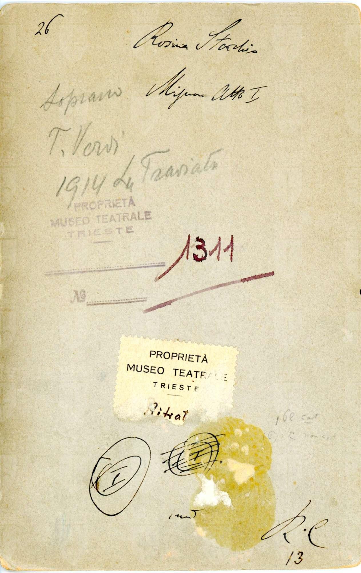 In costume di scena, nel ruolo di Mignon nell'opera omonima. A Trieste ha cantato al teatro Verdi nel 1899 in"Andrea Chenier", "Boheme", "Saffo"e "La resurrezione di Lazzaro"; nel 1914 in"Don Pasquale"e "Traviata"; nel 1920 in "Lodoletta"; al Politeama Rossetti nel 1900 in "Mignon"; al teatro Fenice nel 1894 in "I pagliacci" e nel 1896 in "Mignon" e "La pupilla"