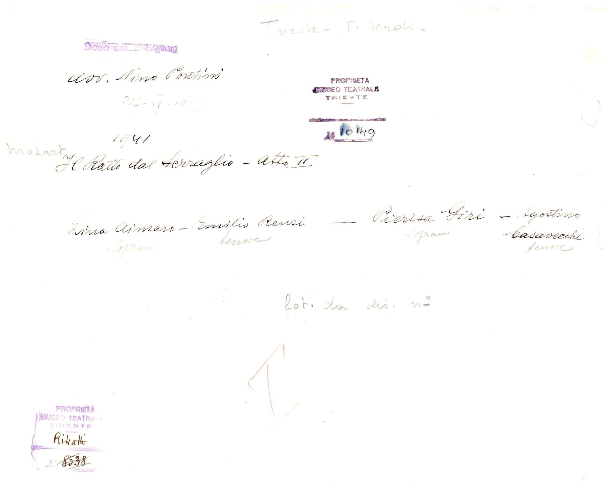 Il ratto dal serraglio, Lina Aimaro, Emilio Renzi, Pierisa Giri e Agostino Casavecchi. Teatro Verdi, Trieste, 1941