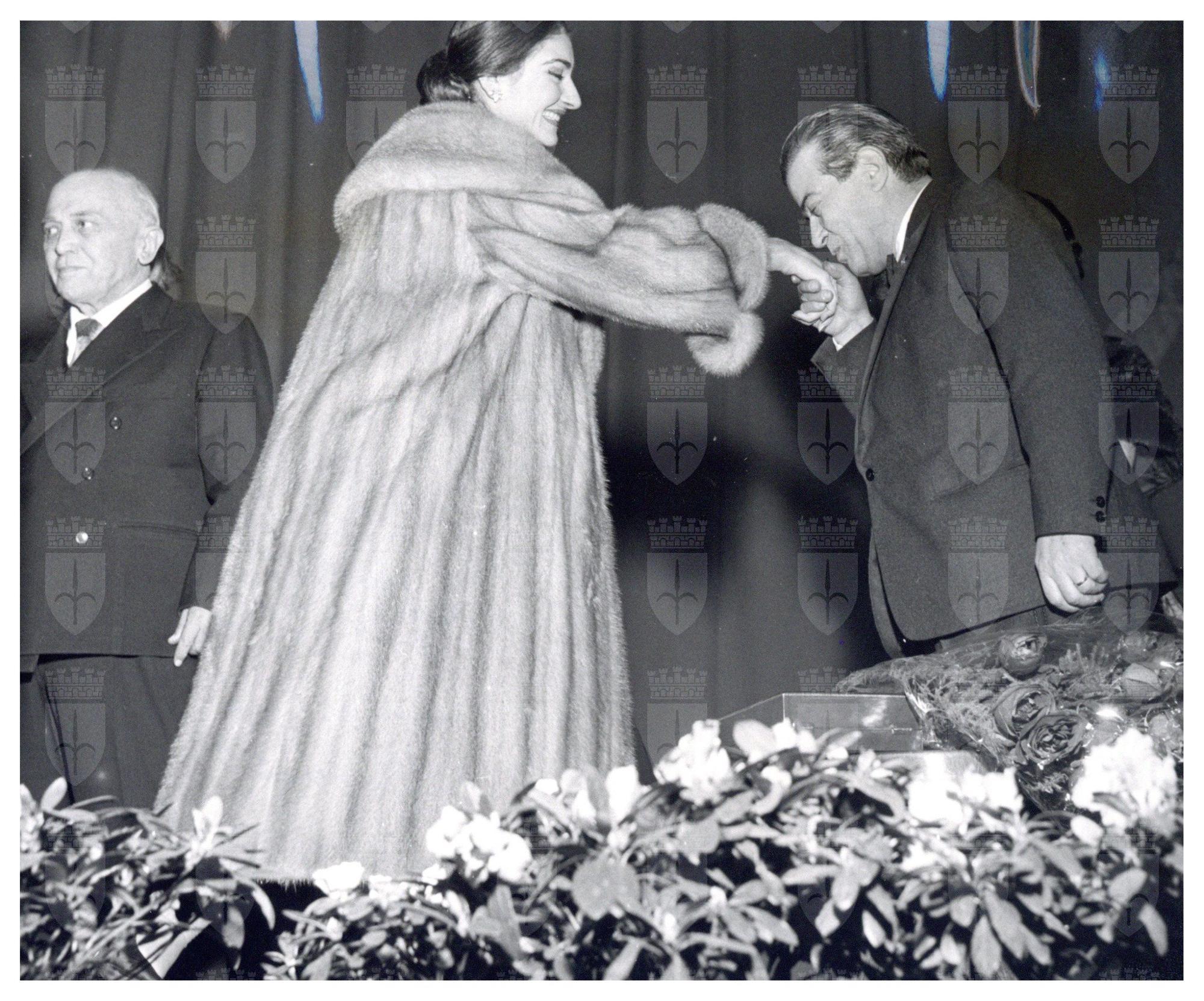 Maria Meneghini Callas, Cinico Angelini e Giovanni Ermete Gaeta (E. A. Mario) autore del Piave, alla Serata della Canzone al Palazzo dello Sport, Milano 22/12/1957