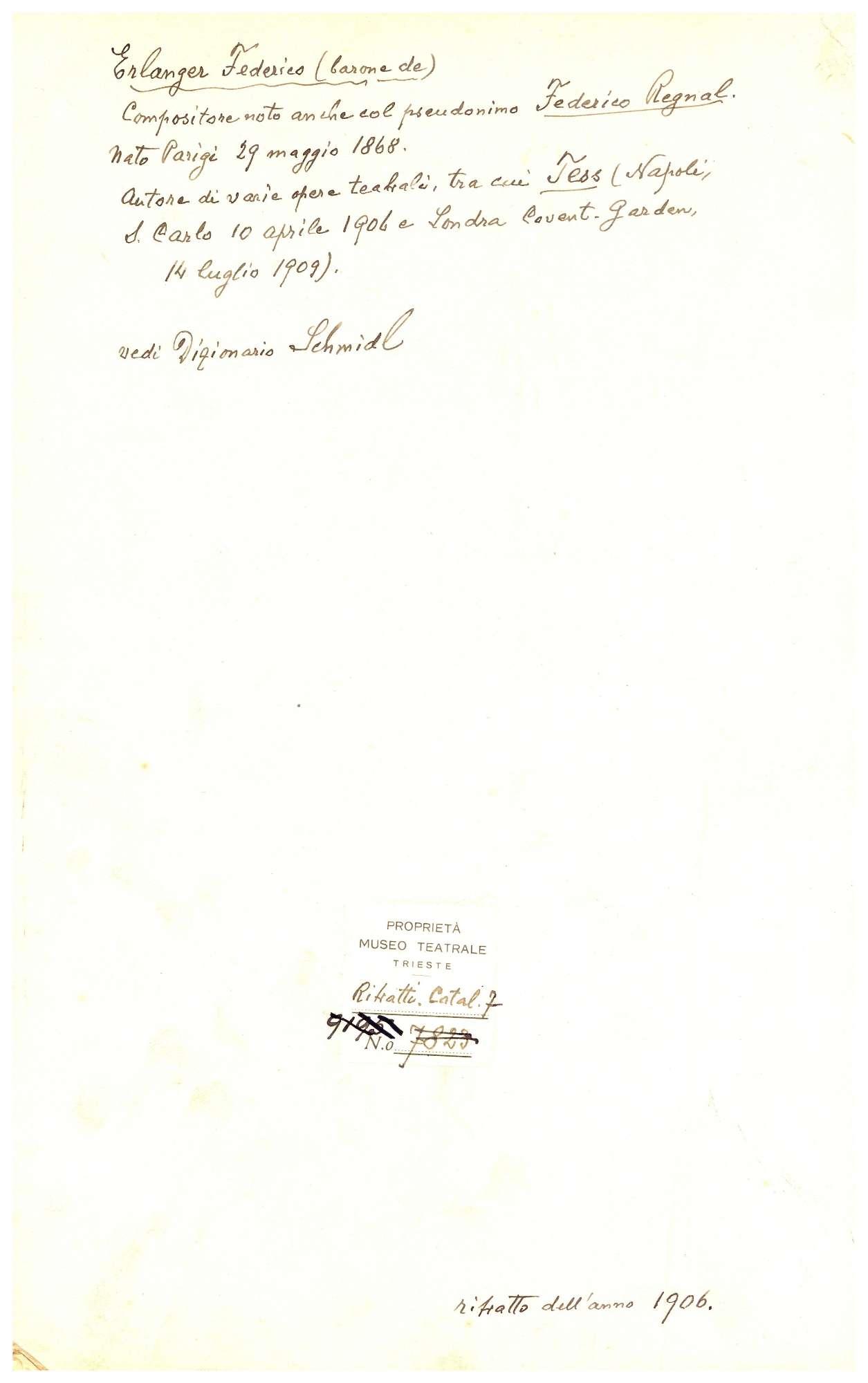 Federico barone d'Erlanger, noto anche come Federico Regnal, nato a Parigi nel 1868, compose diverse opere liriche tra cui Tess