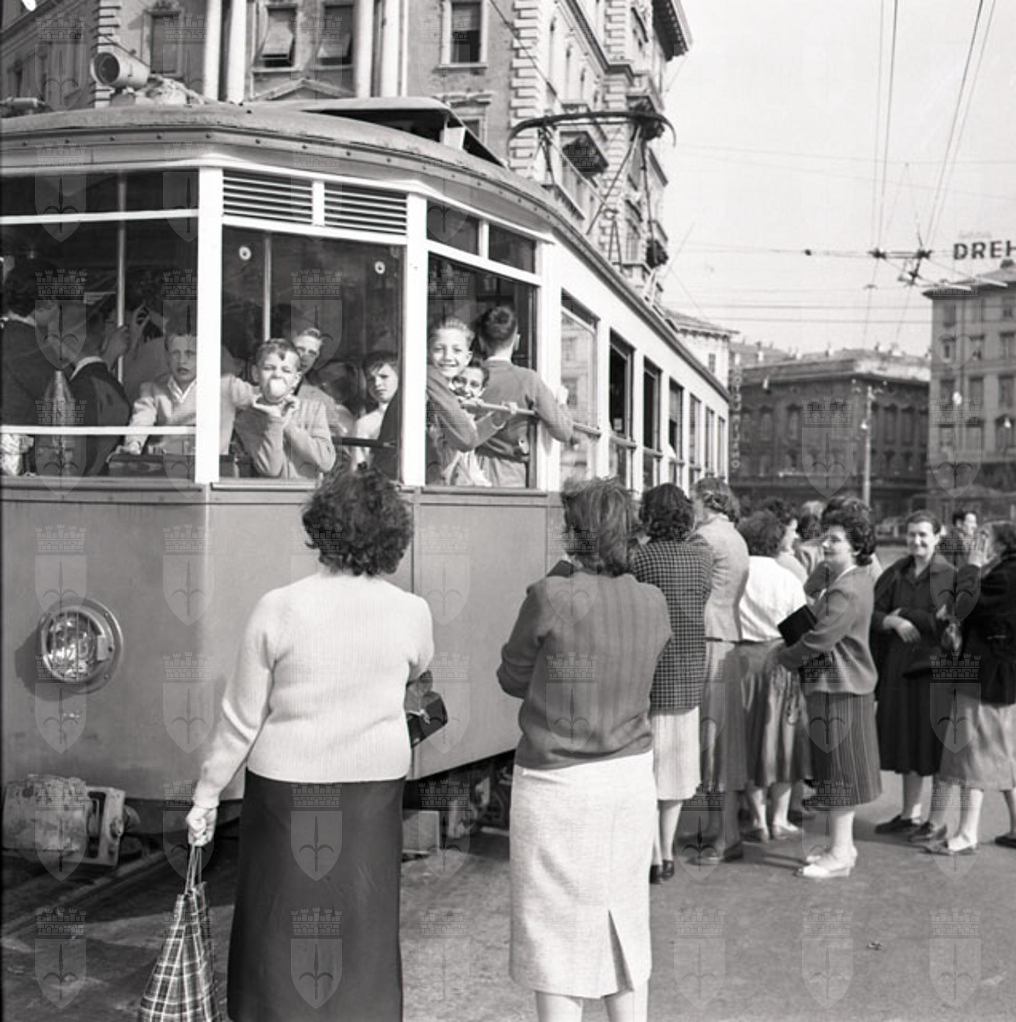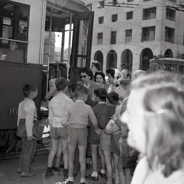 I bambini in Piazza Oberdan prendono il Tram che salendo per Via Cologna arriva ad Opicina