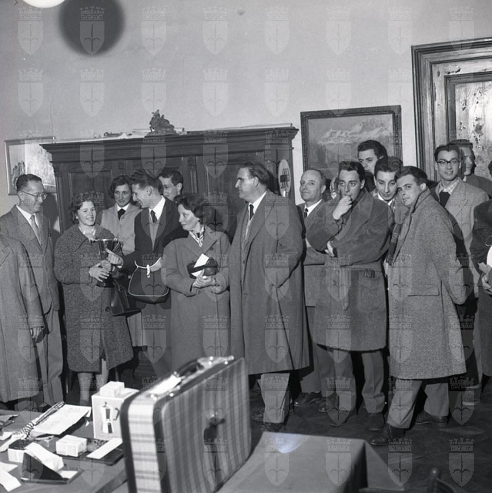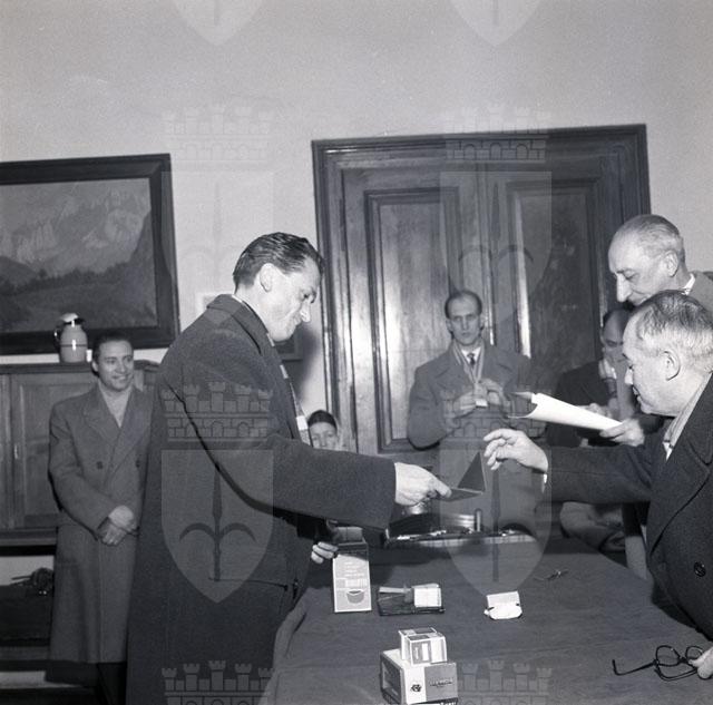 Presso la sede di via Milano della Società Alpina delle Giulie, Renato Timeus consegna il primo premio della miglior immagine del paesaggio carsico a Maristella Zaccariotto