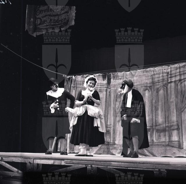 Gli allievi della scuola di recitazione del Teatro Nuovo offrono al pubblico, dopo il saggio di fine d'anno, tre repliche straordinarie dello spettacolo tratto dalla commedia di Carlo Goldoni "Arlecchino servitore di due padroni", con l'attore Giorgio Valletta, per la regia di Fulvio Tolusso. Il Piccolo Sera 08.07.1960