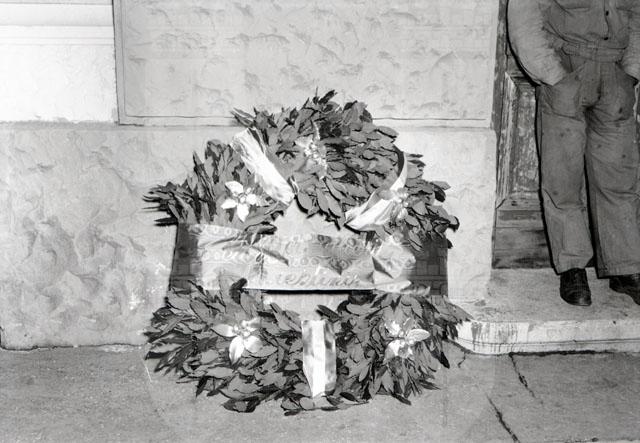 Due corone appese e una targa recante: Primi dalle navi d'Italia all'amplesso di Trieste balzarono i Bersaglieri III novembre MCMXVIII
