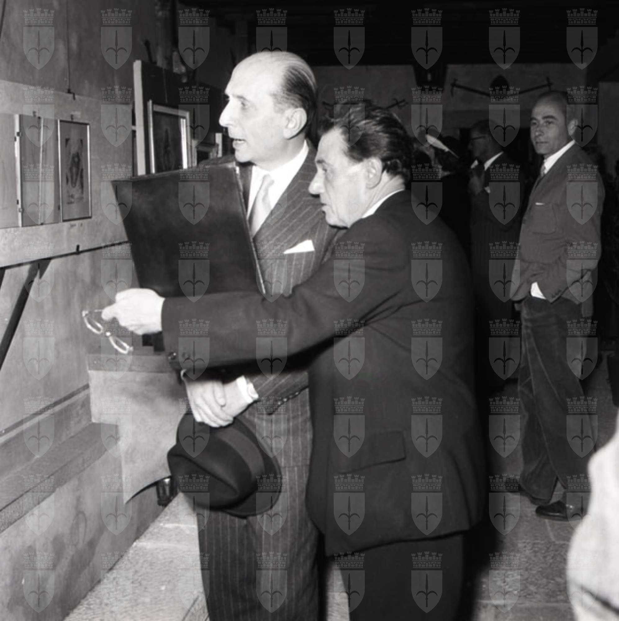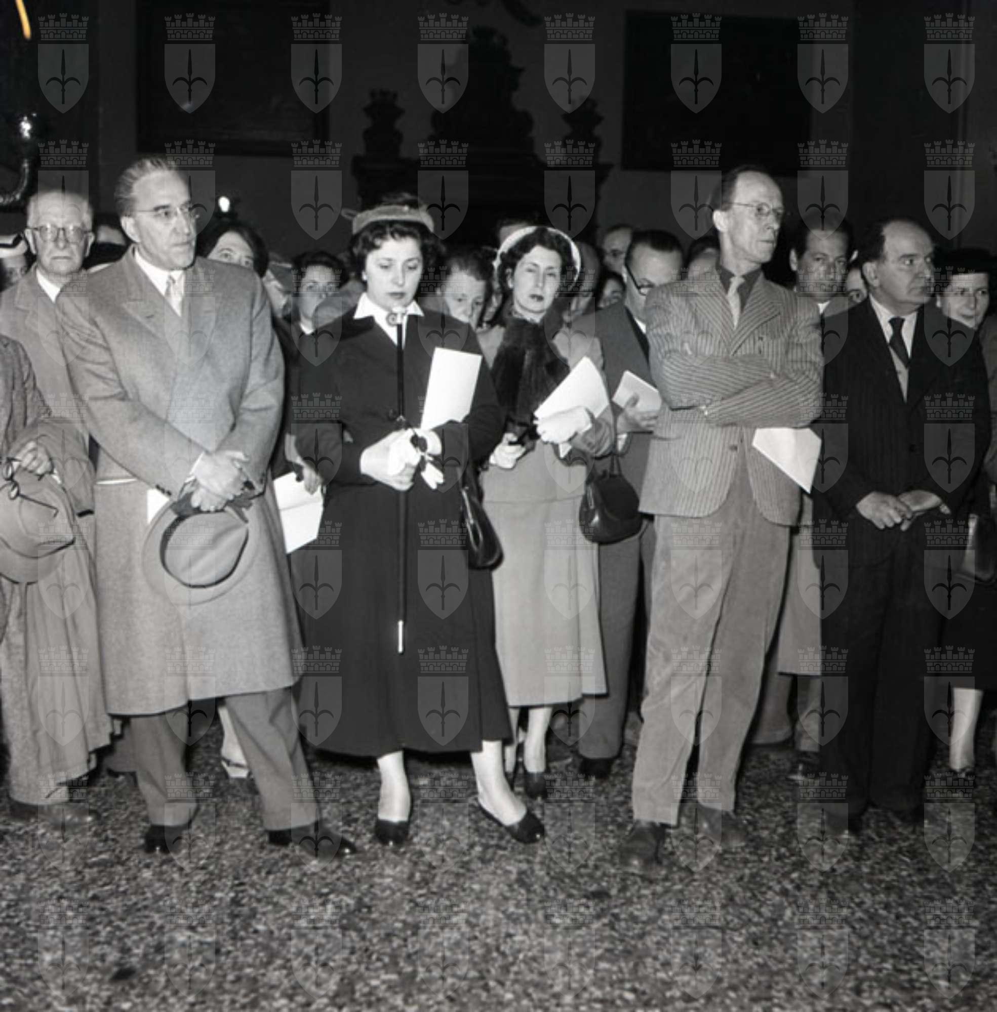 Inaugurazione della mostra al Castello di San Giusto. Presenti tra gli altri il consigliere politico italiano marchese Fracassi, il dott. Vitelli, il pittore Bergagna, il Sindaco Bartoli, il Vescovo Santin. Il Piccolo Sera 21.05.1954