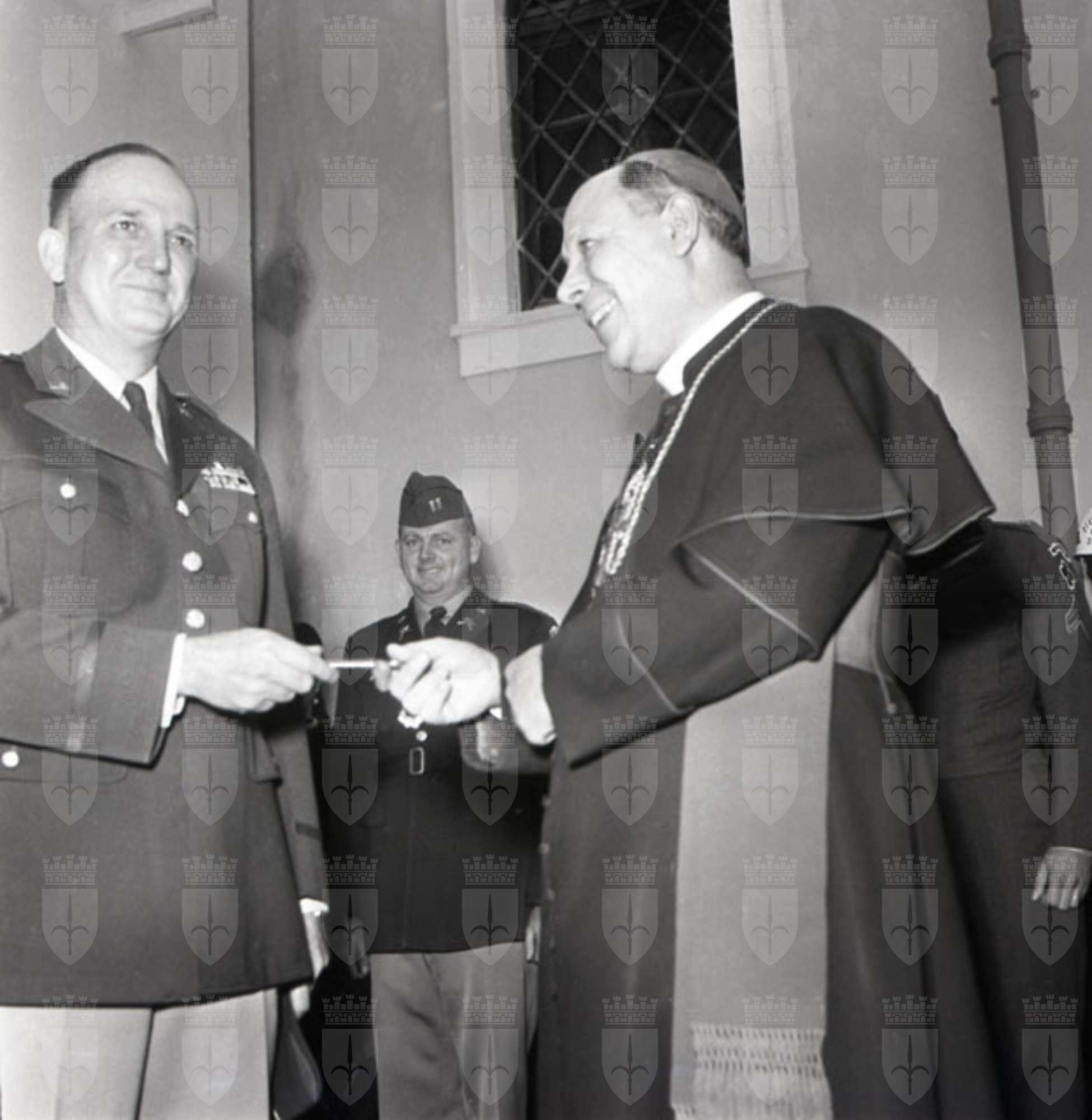 Il generale John A. Dabney consegna al vescovo Santin le chiavi della chiesetta di Banne. Il piccolo tempio, appartenuto a un patrizio triestino, è stato interamente ricostruito dal Genio americano (Giornalfoto, 17.10.1954)