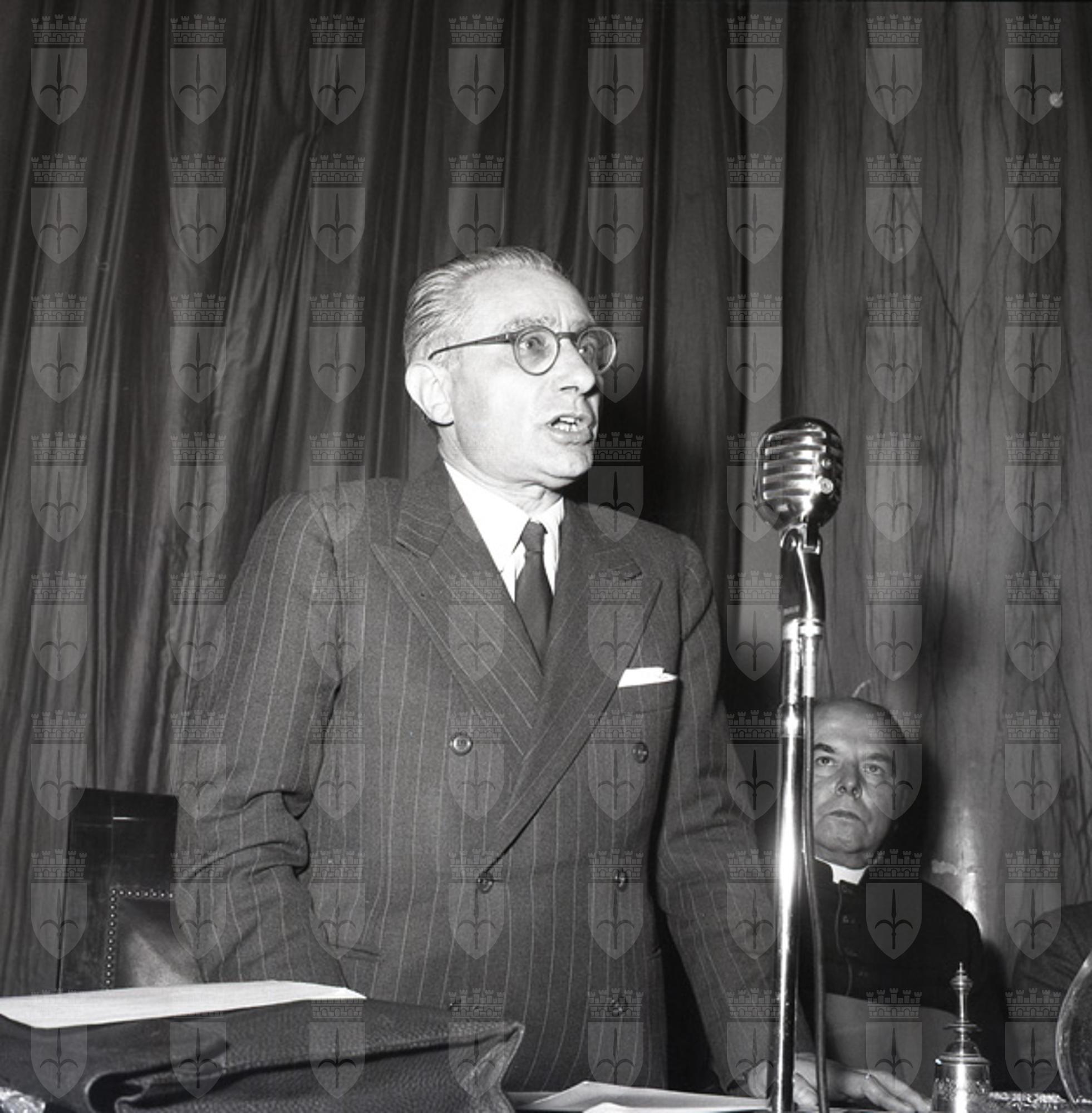Il sottosegretario al Tesoro, Antonio Maxia (4/3/1904 - 15/4/1962), nella sala maggiore della Camera di commercio, insedia la commissione per i danni di guerra. Borsatti, erroneamente, lo definisce ministro