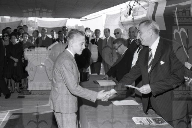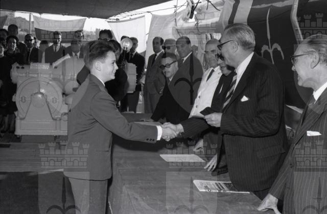 A bordo della motonave Europa, il presidente del Lloyd Triestino, amm. Capponi, consegna le borse di studio assegnate dalla Società.