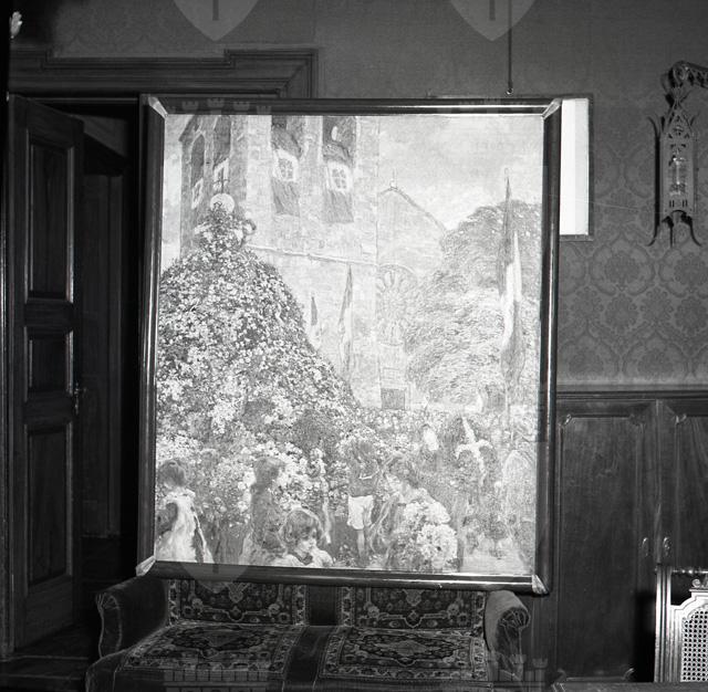 Due dipinti, Piramide di fiori a San Giusto di Ugo Flumiani e Le campane della redenzione di Carlo Wostry, fotografati in una sala del Civico Museo Morpurgo. Il dipinto di Wostry venne esposto per la prima volta al Caffe degli Specchi il giorno dell'annessione di Trieste all'Italia.