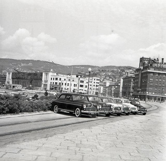 Sei automobili FIAT di vari modelli in un servizio fotografico pubblicitario commissionato dalla ditta di autonoleggi Franco e Bonetta, con sede in via Mazzini 1 a Trieste.