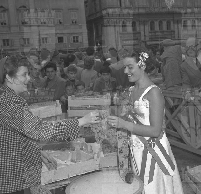 Sfilata di carri allegorici per le vie del centro; Ketty Burba, Miss Trieste 1951, in posa accanto ai grappoli; festa al castello di San Giusto.
