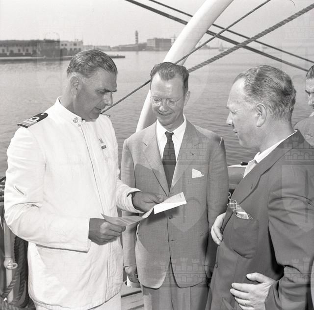 La nave scuola Giorgio Cini dell'Istituto Nautico di Venezia attraccata al molo Audace. Si tratta di un brigantino a tre alberi adibito a nave scuola dal Centro di Cultura marinara della Fondazione Cini e destinato ad accogliere 200 bambini di marinai e pescatori. Foto del comandante, la medaglia d'oro Giovanni Bardini, con alcuni visitatori. Riprese di un bambino alla scrivania, a bordo della nave.