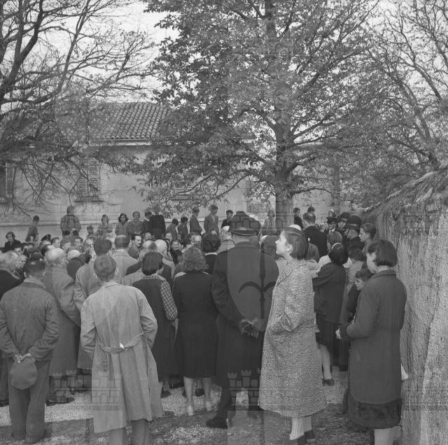 Scoprimento della lapide commemorativa in memoria di Antonio de' Giuliani posta sul sagrato della chiesa di Cattinara, a cura della casa editrice Lo Zibaldone di Anita Pittoni, della Societa di Minerva, sotto gli auspici del Comune. Sulla lapide medaglione raffigurante il de' Giuliani scolpito da Ruggero Rovan (da: La Bora, a. 2, n. 4, aprile 1978, p. 8-9)