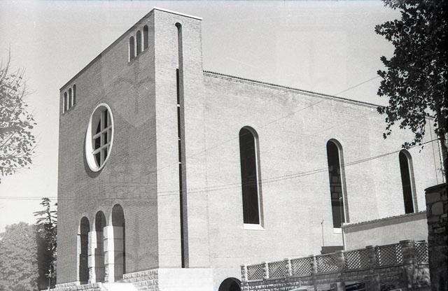 Nel bombardamento aereo del 10 giugno 1944 la chiesa della Beata Vergine delle Grazie (opera dell'arch. Carlo Polli, del 1924) in via Rossetti venne quasi completamente distrutta. La nuova chiesa, progettata dall'arch. Ramiro Meng, venne costruita tra il 1950 e il 1956 in stile neoromanico con accenti novecentisti, mediante l'utilizzo di mattoni a vista con elementi decorativi in pietra d'Aurisina e pietra d'Istria. Nel fotogramma è visibile lo scorcio della facciata con il grande rosone semplificato e le arcatelle stilizzate. Bibl. Massimo Mucci, Architettura e ricostruzione nel periodo del Governo Militare Alleato, p. 118-139, 186-187, in Trieste anni Cinquanta. La città delle forme, Trieste, 2004 e Massimo Mucci, Chiesa e convento della Beata Vergine delle Grazie, p. 281-283, in Paolo Nicoloso-Federica Rovello, Trieste 1918-1954. Guida all'architettura, Trieste, MGS Press, 2005