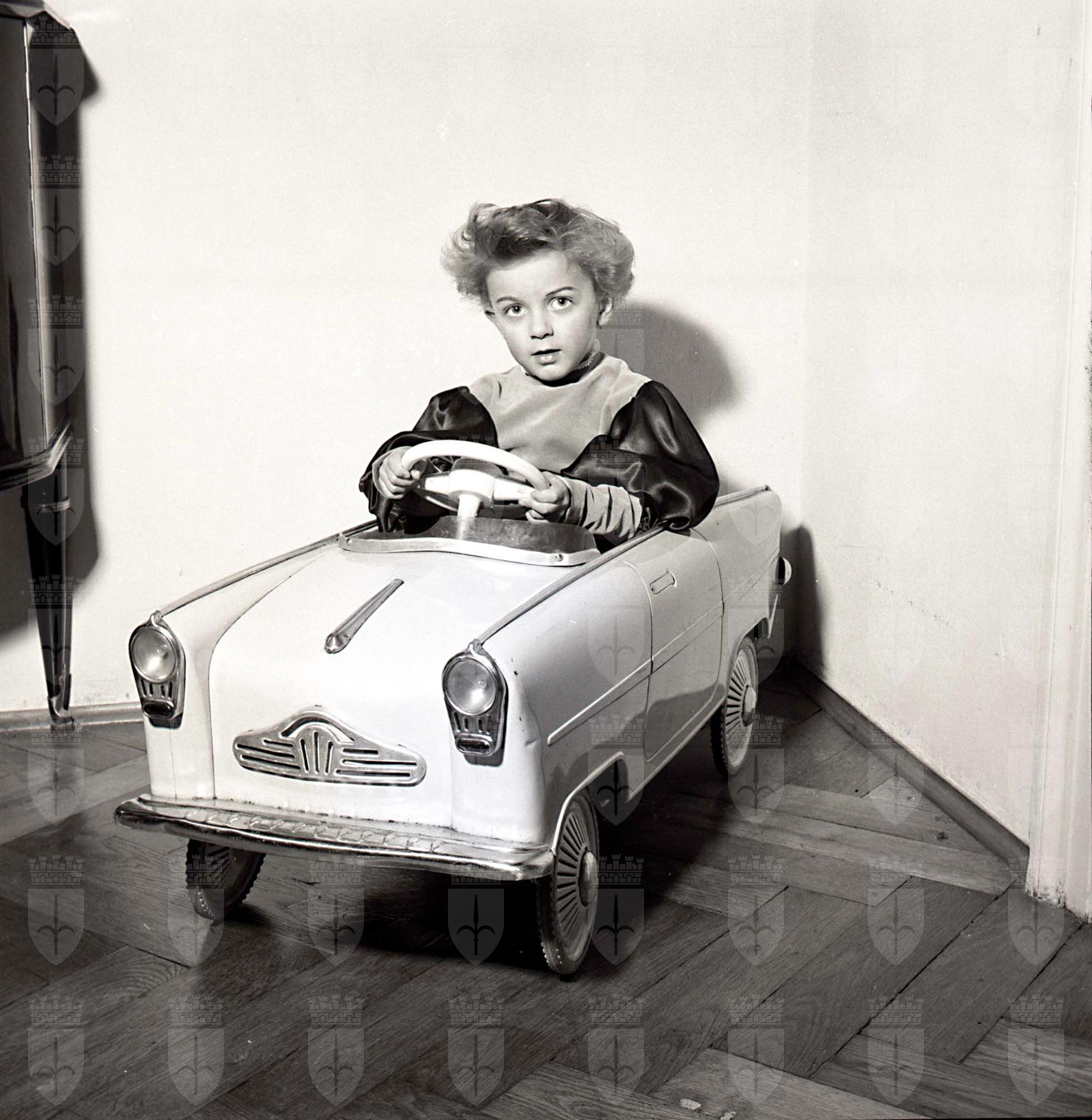 Bambino vestito da principe su cavallo a dondolo e su automobile giocattolo