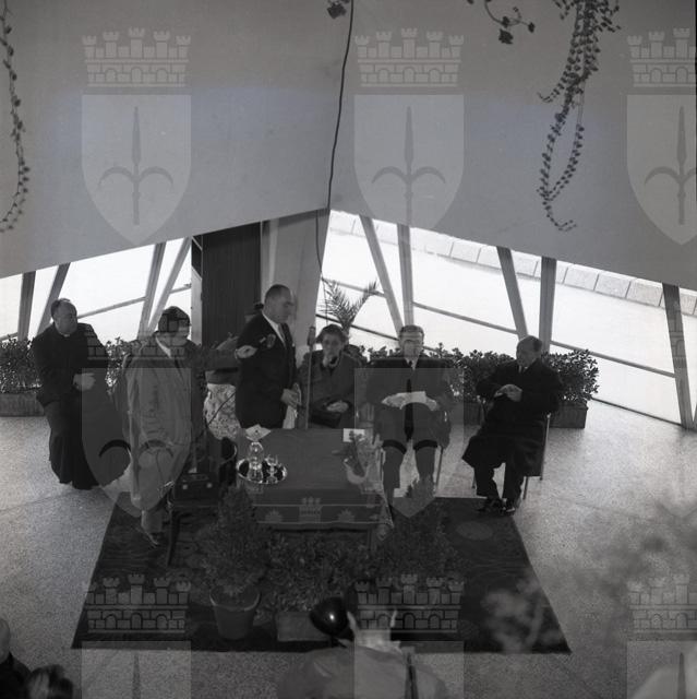 Inaugurato al Villaggio del Fanciullo il nuovo laboratorio di falegnameria; il taglio del nastro viene eseguito dalla figlia dello statista Vittorio Emanuele Orlando che tanto teneva allo sviluppo di questa istituzione. Tra le autorità è presente l'onorevole Giuseppe Pella. Notizie tratte da Il Piccolo 10.12.1955
