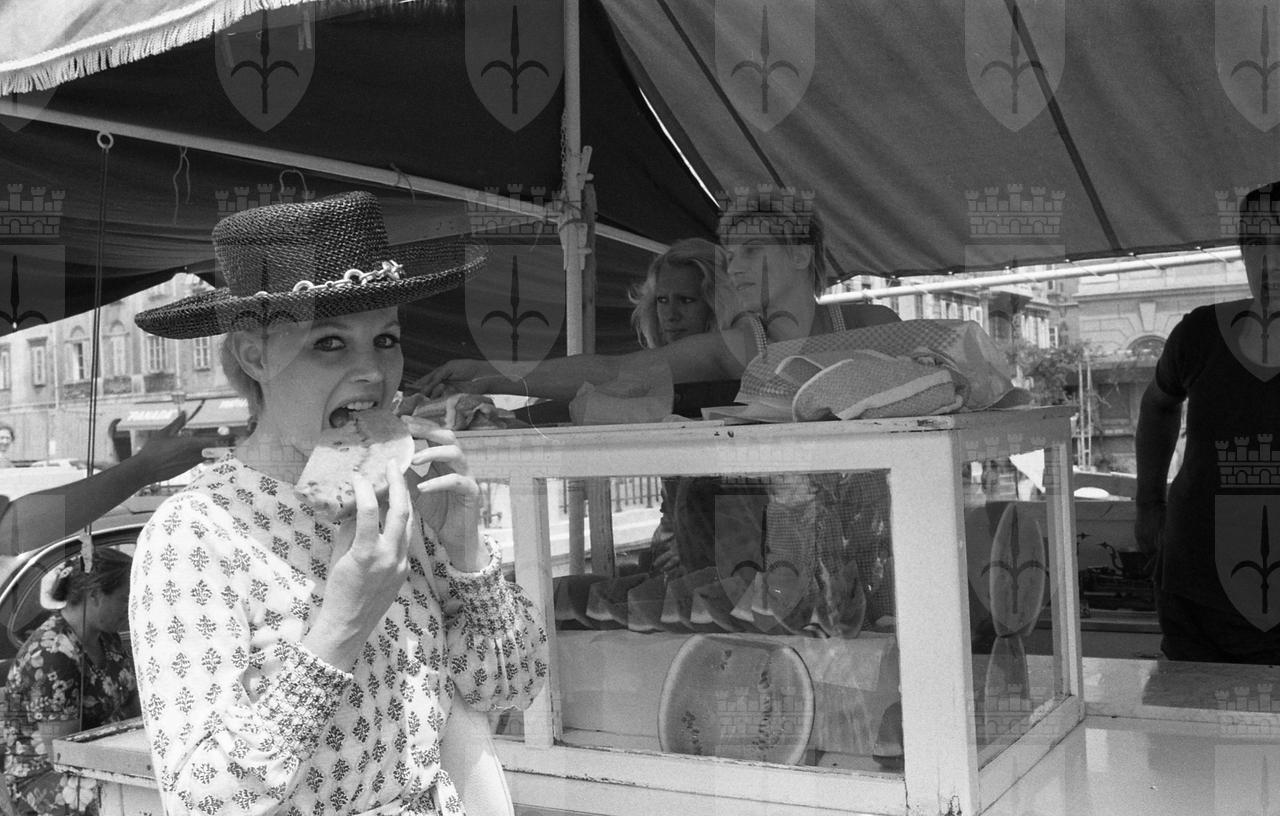 Caroll Baker assiste alla proiezione del film Baba Yaga del regista Corrado Farina insieme all'attrice Isabella da Funes.