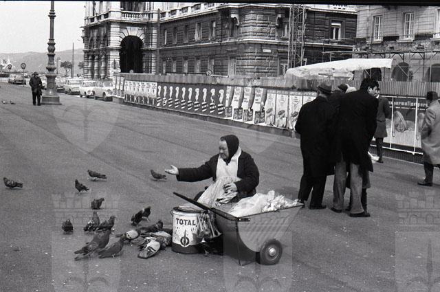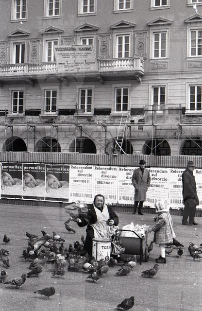 Sullo sfondo i cartelloni per il referendum sul divorzio del 1974