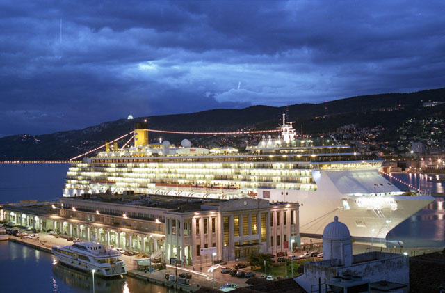 Stazione marittima, nave crociera, Costa Atlantica, rive di Trieste, notturni, pescheria, foto artistiche, turisti, piazza Unità notturni, rive.