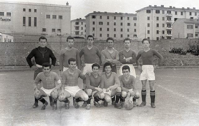 Sullo sfondo del ritratto della squadra dei calciatori si intravede l'edificio recante l'insegna del Cinema Lumiére di via Flavia