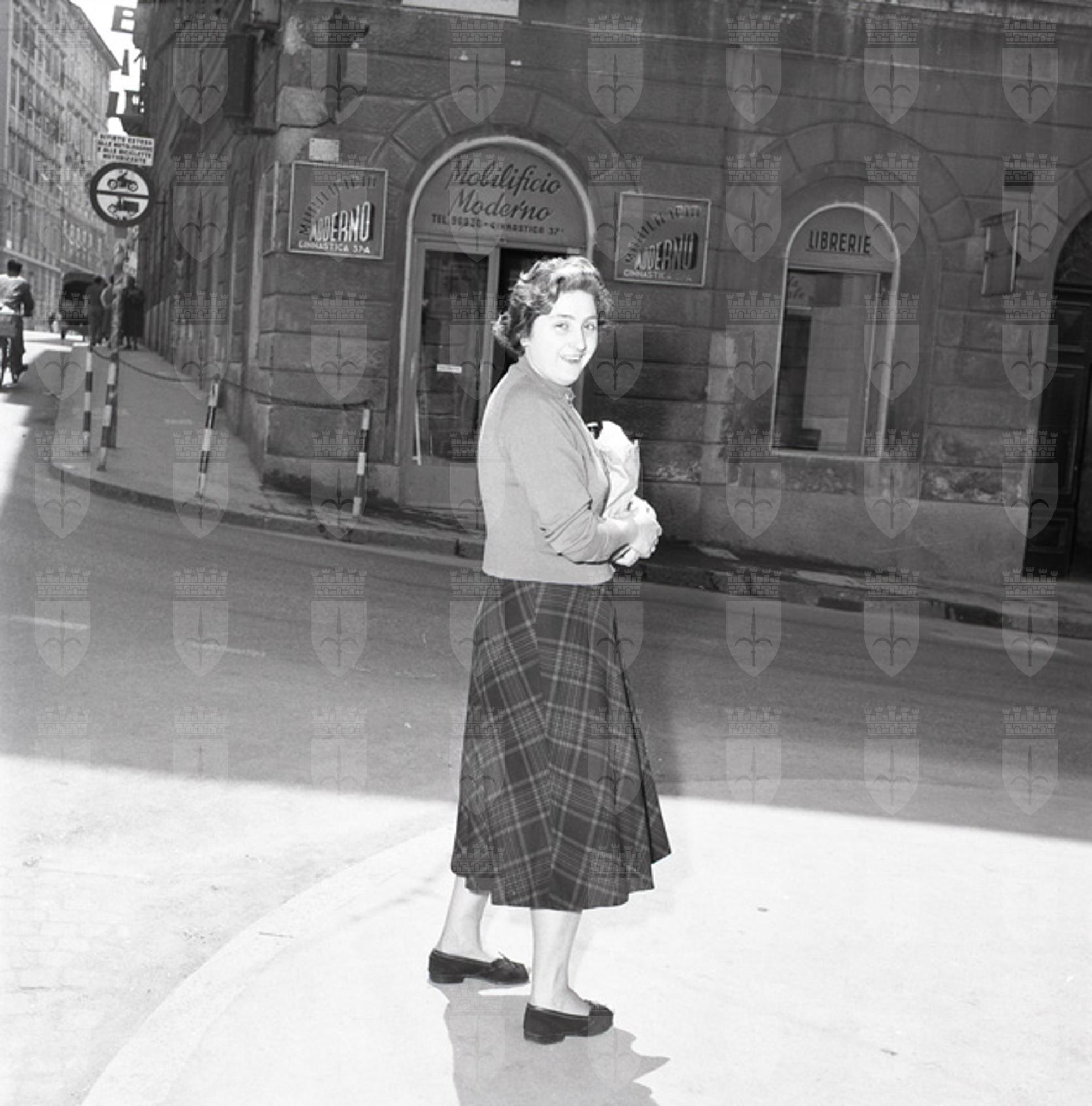 Signora ritratta in via Ginnastica davanti al Mobilificio Moderno al n. 37a
