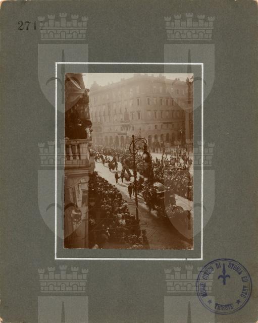Felice Venezian, avvocato, esponente di rilievo della massoneria, svolge il ruolo di capo carismatico indiscusso del movimento liberalnazionale per un ventennio, riuscendo a tenere unite le diverse anime della comunità italiana sotto una guida conservatrice ed intransigente, capace però di tenere a freno gli esponenti più radicali. La sua prematura scomparsa lascia un pesante vuoto nel movimento. Si presume che le foto siano state fatte da Benque dalla posizione dello studio fotografico con le finestre che guardano proprio sulla Piazza della Borsa, il punto di riferimento il balcone e il lampione.