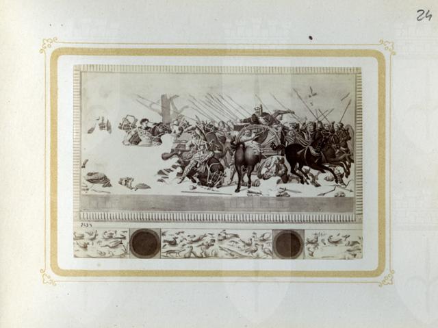 Mosaico trovato nella casa del fauno di Pompei il 24 ottobre 1831 riproducente la battaglia di Isso compiuta da Alessandro Magno contro Dario III di Persia, copia del dipinto del pittore greco Filosseno di Eretria. Nel settembre 1843 il mosaico fu trasferito a Napoli.