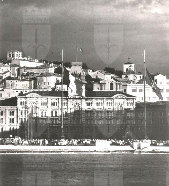 Piazza dell'Unità e colle di San Giusto al tramonto visti dal mare