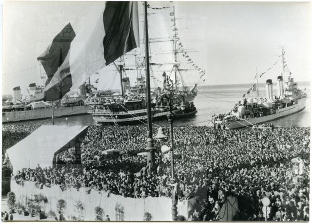 4 novembre 1954 parata militare alla presenza del Presidente della Repubblica Luigi Einaudi. Tra le unità della Marina militare gl'incrociatori: Duca degli Abruzzi, Montecuccoli, le torpediniere Libra e Cassiopea, il cacciatorpediniere Artigliere e la nave scuola Amerigo Vespucci. Il Presidente arriva accompagnato dal presidente del consiglio Scelba e il Ministro della difesa Taviani; nella cattedrale di San Giusto monsignor celebra il Te Deum. In quell'occasione il presidente riceva la laurea Honoris Causa in Economia e Commercio