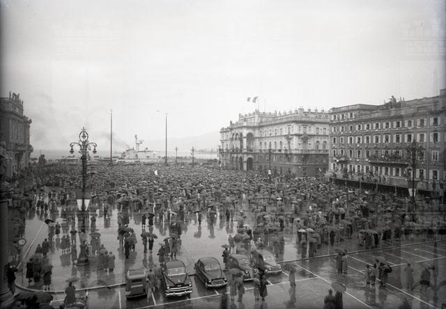 ln piazza Unita' d'Italia, sotto la pioggia, la folla attende l'arrivo delle truppe italiane.