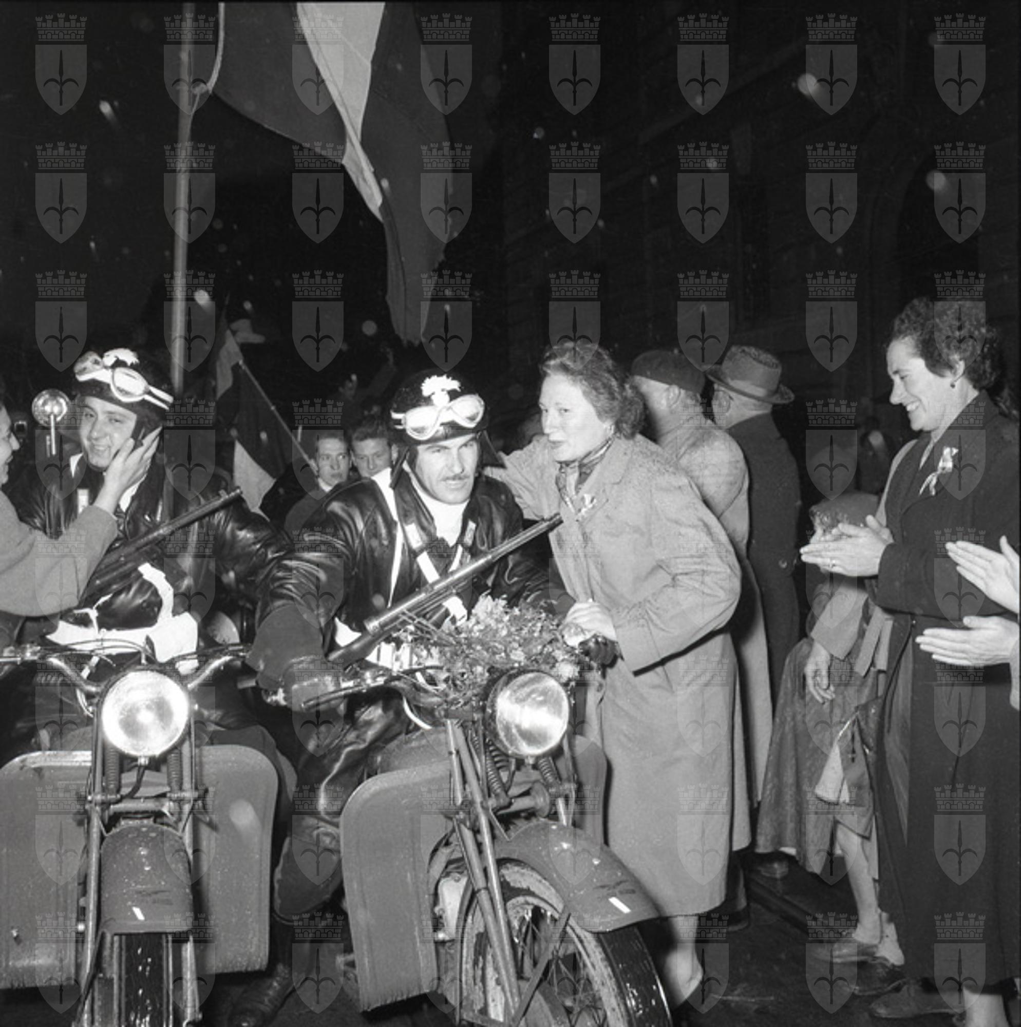 26 ottobre [1954] E' finalmente giunto il giorno tanto agognato: per tutta la notte moltissimi triestini hanno atteso, sotto la pioggia, l'arrivo dei nostri soldati nei pressi del posto di blocco di Duino, per essere i primi a dar loro il benvenuto e alfine, verso l'alba, sono apparsi i primi camion militari. Lungo tutta la costiera, fino a Barcola e poi, sempre piu', fino in citta' si sono avute manifestazioni di gioia: la lunga autocolonna e' avanzata con difficolta' tra due ali di folla festante ed entusiasta, che, ai piu' anziani, ha fatto ricordare le memorabili giornate del 1918 (da: Ugo Borsatti, Trieste 1954, fotografie dell'Archivio Storico "Foto Omnia" di Ugo Borsatti di proprieta' della Fondazione CRTrieste, Trieste, Lint, 2004, p. 68).