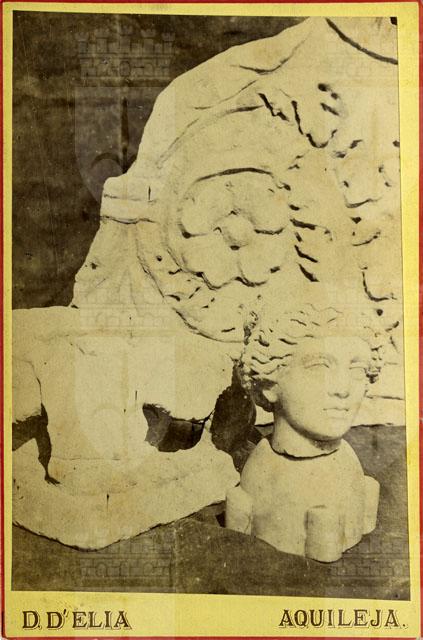 In primo piano vi è il volto di una figura femminile, forse da identificare con Afrodite Anadiomene per la presenza della benda tra i capelli, su piedistallo. La scultura, realizzata in marmo alabastrino, è spezzata alla base del collo ed è consunta in più punti. L'irregolarità di alcuni tratti del volto fanno addirittura ipotizzare che essa possa essere stata rilavorata in un secondo tempo con intento iconografico. Dietro alla testa si riconosce un rilievo architettonico fortemente aggettante con un'ampia voluta vegetale terminante con un fiore a quattro petali. La foto fu scattata al museo di Aquileia, come cita la didascalia, prima che il volto femminile venisse inviato a Vienna, al Kunsthistorisches Museum, dove ancora oggi si trova.